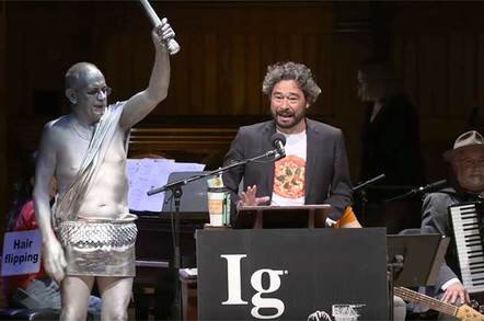 Победителям были вручены уникальный трофей Ig Nobel, сертификат и 10 триллионов зимбабвийских долларов. Победившие исследовательские команды получили свои призы от настоящих нобелевских лауреатов, в том числе британца Рича Робертса, получившего Нобелевскую премию за «Физиологию или медицину» в 1993 году. Победителями Ig Nobel Prize 2019 стали: Медицина (Италия): за сбор доказательств того, что пицца может защитить от болезней и смерти, если она производится и употребляется в Италии. Медицинское образование (США): для использования единой техники дрессировки животных, называемой «обучением кликерам», для подготовки хирургов к выполнению ортопедических операций. Биология (Сингапур, Китай, Австралия, Польша, США, Болгария): за обнаружение того, что мертвые намагниченные тараканы ведут себя иначе, чем живые намагниченные тараканы. Анатомия (Франция): за измерения асимметрии температуры мошонки у голых и одетых почтальонов во Франции. Химия (Япония): для оценки общего объема слюны, пр