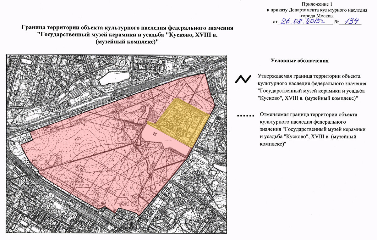 (*1) Приказ Департамента культурного наследия от 26 августа 2015 г. № 134 "Об утверждении границ территорий объекта культурного наследия федерального значения "Государственный музей керамики и усадьба "Кусково", XVIII в. (музейный комплекс)" и объекта культурного наследия регионального значения (памятника садово-паркового искусства) "Усадьба "Кусково"