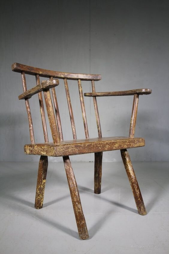 There are lots of vernacular stick chairs styles out there if you do a little digging. Researcher Suzanne Ellison has been turning over a lot of rocks lately to find stick chairs in countries such as Sweden, Germany and Italy. Today she sent over a load of images of Irish chairs, and this one stuck in my head. It’s a fairly common form and common paint scheme.