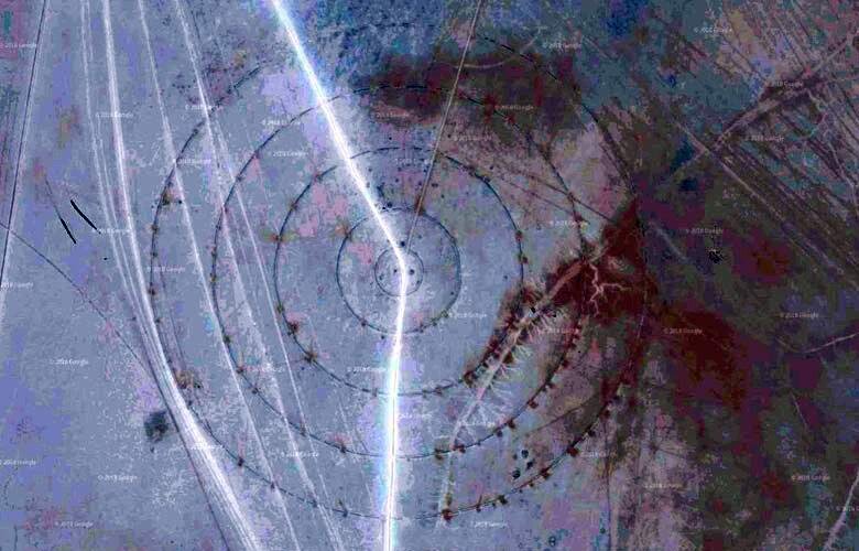 Уфологи сделали удивительную находку, рассматривая окрестности американской военной базы - Зоны 51 расположенной в Неваде. Посреди высохшего озера Грум-Лэйк недалеко от горы Квартцит они обнаружили непонятный огромного размера рисунок на земле. Изображение представляет пять идеально ровных кругов, вписанных друг в друга с равным отступом. Не вызывает никаких сомнений то, что это рукотворный объект, непонятно кем и для какой цели нанесен на дно высохшего озера. Исследователи выдвигают самые различные и невероятные гипотезы происхождения странного рисунка. Но, специалисты сходятся во мнении, что причиной всему является знаменитая Зона 51, располагающаяся поблизости. Может ли это быть секретная взлетная площадка для летающих дисков или секретных самолётов Пентагона? Или гигантские круги оставили представители внеземной цивилизации? Увы, правдивый ответ на этот вопрос мы вряд ли получим ближайшее время...