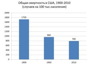 В течение 20 века значительно, примерно в 2 раза, снизилась общая смертность, причём наиболее резкое снижение произошло в первую половину века (см.рисунок).