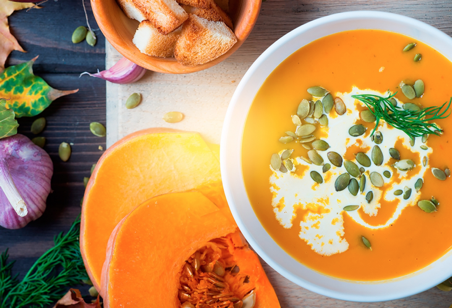 Теплое и мягкое блюдо осеннего меню, которое приготовлено с должной степенью нежности, приятно согревает не только желудок, но и душу – как того, кто его пробует, так и того, кто его готовил. Нежные супы-пюре как нельзя кстати могут привести в хорошее расположение духа, согреть и окутать уютом даже в самые ненастную пору. Осенние дни несут с собой все меньше солнца, к которому мы все привыкаем в весеннее-летний период года. Организм нуждается в энергии, которой с приходом осени недополучает. В данном случае на помощь приходит верный выбор ингредиентов и блюд – сочные овощные культуры, совмещенные с мясом и птицей. Таким блюдом осеннего сезона является оригинальный суп-пюре из тыквы со свежими овощами, добавлением толики специй и фрикадельками из куриного мяса. Кстати говоря, в ста граммах тыквенной мякоти содержится не так уж и много калорий – всего-то двадцать три единицы. В качестве емкости для этого супа используют аккуратно вычищенную тыквенную кожуру, в которой суп запекают, испол