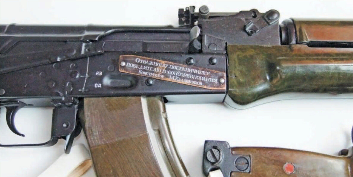 Время от времени изготавливались автоматы Калашникова, украшенные дарственными табличками с теплыми словами и пожеланиями от Михаила Тимофеевича. В большинство случаев такие экземпляры прямо с конвейера продавались в государственные музеи на вечное хранение, и только Пограничные войска КГБ СССР удостоились чести иметь в своих оружейных комнатах подобное оружие.