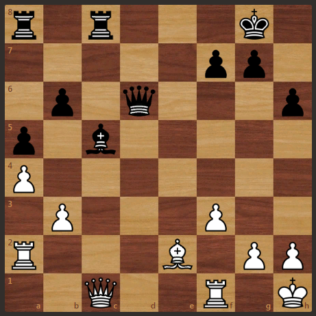 Предлагаю найти выигрыш в равной позиции. На шахматной доске полное материальное равенство, разноцветные слоны. Однако ход черных, черные начинают и получают материальный перевес. Подпишитесь на канал и будут новые интересные задачи Решение публикую далее 1. .... черные идут слоном на g1 и грозят поставить мат в 1 ход. 2. Белые бьют слона на g1 королем, черные забирают ферзя на с1. Подпишитесь на канал и будут новые интересные задачи