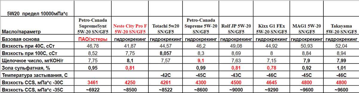 Учитывая что многие ездят зимой на "псеводояпонских", "псевдонемецких" и псевдооригинальных маслах отечественного и прочих корейских\малайзиских\сингапурских разливов и даже не подозревают о том, что их масло формально заваливает CCS и не испытывают проблем при заведении при -35-36С, было проведено небольшое исследование. Оказалось что CCS до 10000мПа*с при -35С не является проблемой при заведении двигателей, если свечи сухие и чистые, стартер исправен, АКБ заряжен — заводится как ни в чем не бывало. Этим мы и воспользуемся, чтобы немного съэкономить в зиму. Ниже будет небольшой список масел, у которых вычислен примерный CCS при -35С (каждые -5С увеличивают CCS примерно вдвое), все основные данные были сведены в таблицу. Цен в таблице нет — они свои для каждого региона. Но помните, если вы нашли дешевую нулевку (в данном случае 0W20), не значит что его CCS впишется в стандарт не более 6200мПа*с, скорее всего это масло окажется пятеркой с отличным CCS<5000мпа*с, а при -35С будет в диап