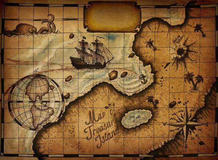 Слухи и легенды о пиратских сокровищах, какие-то намеки, обрывки таинственных карт ходили уже в 18 веке. Тогда же, люди принимаются усердно разыскивать клады. Многие «точные сведения» обернулись вымыслом, а что-то, казавшееся вымыслом, оказалось истиной. И всего удивительнее, что руководством для кладоискателей сделался роман Стивенсона и карту Острова сокровищ, которую писатель сочинил на досуге, соотносят с подлинными координатами острова Пинос в Карибском море. Расположение Острова сокровищ и его очертания, Северная и Южные бухты, холм Подзорной трубы, холмы Бизань-мачты и Фок-мачты напоминают реальное место — остров Пинос неподалеку от Кубы, в самом дела служивший в течение нескольких столетий приютом пиратов. Здесь могли лежать сокровища Дрейка, Моргана, Черной Бороды. Эдуарт Тич, Черная Борода, он же Черный мститель испанских морей, как раз и был прототипом стивенсоновского капитана Флинта. Корабль капитана Флинта, потопленный в устье реки Джеймс в штате Сеерная Королина, был н