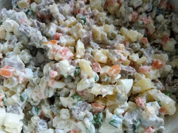 Вот я не представляю Новый год без оливье и мне пришлось придумать вегетарианское оливье или оливье без мяса и яиц! Оливье можно употреблять в пишу и людям которые соблюдаю пост - главное найти постный майонез! Нам понадобиться: - 400 гр зеленого горошка; - 4 средних клубня картофеля; - 400 гр соленых огурцов; - 400 гр маринованных шампиньонов; - зеленый лук (по вкусу); - постный майонез. Самый главный принцип оливье – всех ингредиентов должны быть равные части по объему, меньше может быть только картофеля, а больше только зеленого горошка Как сделать 1. Заранее нужно приготовить картофель, либо сварить «в мундирах», либо запечь в духовке в фольге. После того как картофель будет готов оставить его остывать. А потом, нарезать небольшими кубками картофель и поместить в емкость для салата; 2. Соленые огурцы очищаем нарезаем примерно такими же кубиками как и картофель. Добавляем нарезанные огурцы в салатницу; 3. Добавляем зеленый горошек в нашу емкость; 4. Берем наши маринован