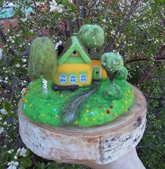 Работа выполнялась поэтапно, сначала был свалян домик, потом полянка, домик привалялся к поляне. Появились кусты.