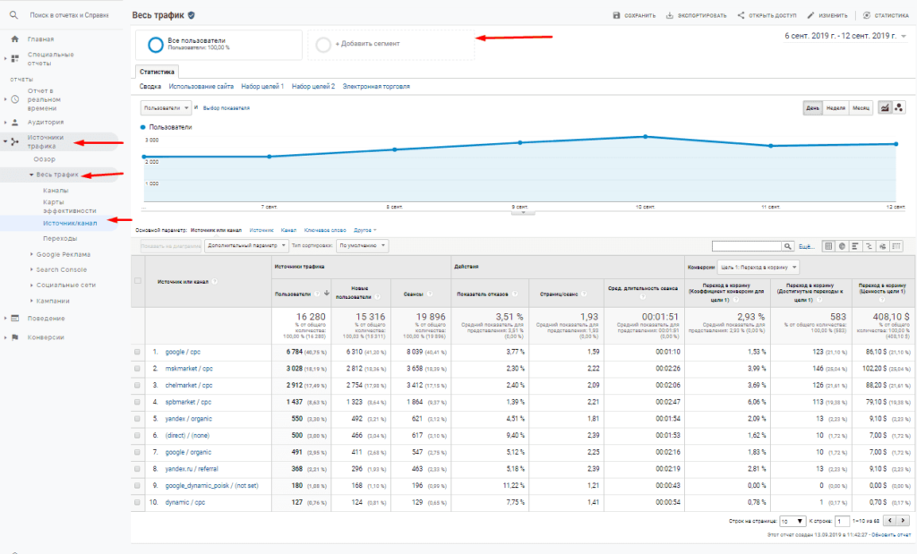 Для того, чтобы создать сегмент после установки Google Analytics потребуется открыть любой отчет, например, «Источники трафика»-«Весь трафик»-«Источник/канал» и воспользоваться фильтрами и нажимаем на «Добавить сегмент».