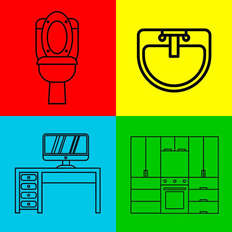 - Желтый цвет - остальная санитарная зона или санитарные объекты (раковины, краны, полки, плитка на стенах, внутренние перегородки, двери и др.).