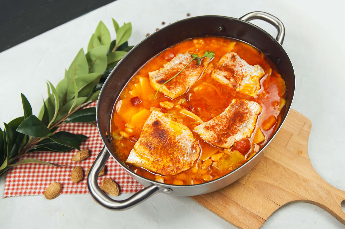 зелень Способ приготовления 1. Нарезаем чоризо на средние кубики, обжариваем, чтобы вытопить жир. Затем на жиру обжариваем нарезанные морковь, репчатый лук и стебли сельдерея. 2. Добавляем консервированные томаты в собственном соку, вливаем воду, добавляем тонкие слайсы картофеля, солим и оставляем томиться на 7 минут. Затем добавляем консервированную белую фасоль. 3. Выкладываем поверх овощей 600-800 г филе трески, нарезанного на крупные куски, приправляем сладкой молотой паприкой и даём блюду 5 минут приготовиться. При подаче украшаем зеленью. Приятного аппетита! Еще больше рецептов на сайте tveda.ru Любите читать Дзен Телеканала «Еда»? Расскажите свое мнение о материале в комментариях и ставьте лайки