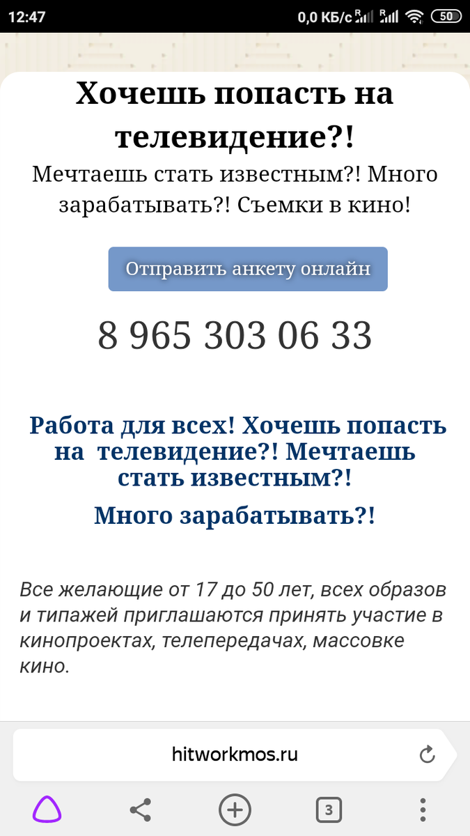 Добрый день! Хочу предостеречь Всех желающих обратиться к данному сайту, а также к сайту собрату startprofession.ru (клон сайта hitworkmos.ru) для легкой наживы и обогащения. После того как вы отправили анкету проходит пару дней и Вам перезванивает некая женщина (бабушка божий одуванчик), представляется как агент по кадрам киностудии (название киностудии не называет) зовут Нина Алексеевна телефон +7 (903) 581-81-93, и сообщает, что Вас выбрали для съемок в массовке и на небольшую роль второго плана с минимум слов в съёмках телесериала, но для того чтобы утвердить Вас на данную роль необходимо Ваше портфолио с профессиональной актерской съёмкой в соответствующей фотостудии. Причем настоятельно рекомендует при отсутствии портфолио решить этот вопрос до конца текущего дня, так как утвердят другого человека. Во время телефонного разговора, так, невзначай интересуется, есть ли знакомый фотограф, который может выполнить съёмку на профессиональном уровне, если таковой отсутствует предлагае