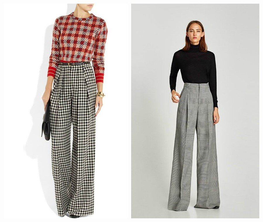 Наступила золотая осень, и хочется носить что-то уютное и стильное одновременно. Еще зимой я отметила для себя некоторые хотелки: 1. одежда с клетчатым принтом, в идеале - брюки. Очень понравился такой образ: 2. брюки с талией "paper bag" Я обладатель тяжелого низа, не очень длинных ног, но достаточно тонкой талии. Поэтому были сомнения, что мне подойдет низ с клетчатым принтом. Брюки paper bag хотела примерить, так как говорят, они подходят обладательницам тонкой талии. Ну а фасон "Марлен" удлиняет ножки - в моем случае то, что доктор прописал)) Какова же была моя радость, когда в мае аутлете "Woss" я обнаружила одни брюки со всеми тремя составляющими за 690 рублей. Бинго! Я их примерила, и это была любовь с первого взгляда. В Родном магазине "Stradivarius" начальная цена на них была 2300, со скидкой 1299, а в аутлете - в два раза дешевле скидочной цены. Их даже подшивать не пришлось. Вот пример цены на мою модель брюк из интернета: Уже в июле, бродя по "Фамилии" я нашла отличный