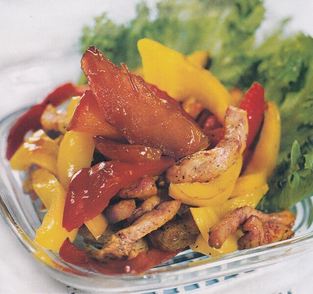 20-30 минут вместе с обработкой овощей КОЛИЧЕСТВО ПОРЦИЙ: 2 ИНГРЕДИЕНТЫ: В оставшуюся после яблок сковороду с карамелью необходимо добавить яблочный сок, сливочное масло и острый красный перец. На слабом огне, постоянно помешивая, кипятить заправку, пока она не загустеет. Следует отметить, что удивительный вкус салату придает сочетание остроты красного перца и сладость карамелизованных яблок. Этот салат не составит труда приготовить в обычные дни, так его ингредиенты почти у всех всегда есть на кухне. Каждое приготовленное блюдо, должно быть не только вкусным, но и красивым, прекрасное сочетание зеленого салата, красных яблок и желтого перца радует глаз.