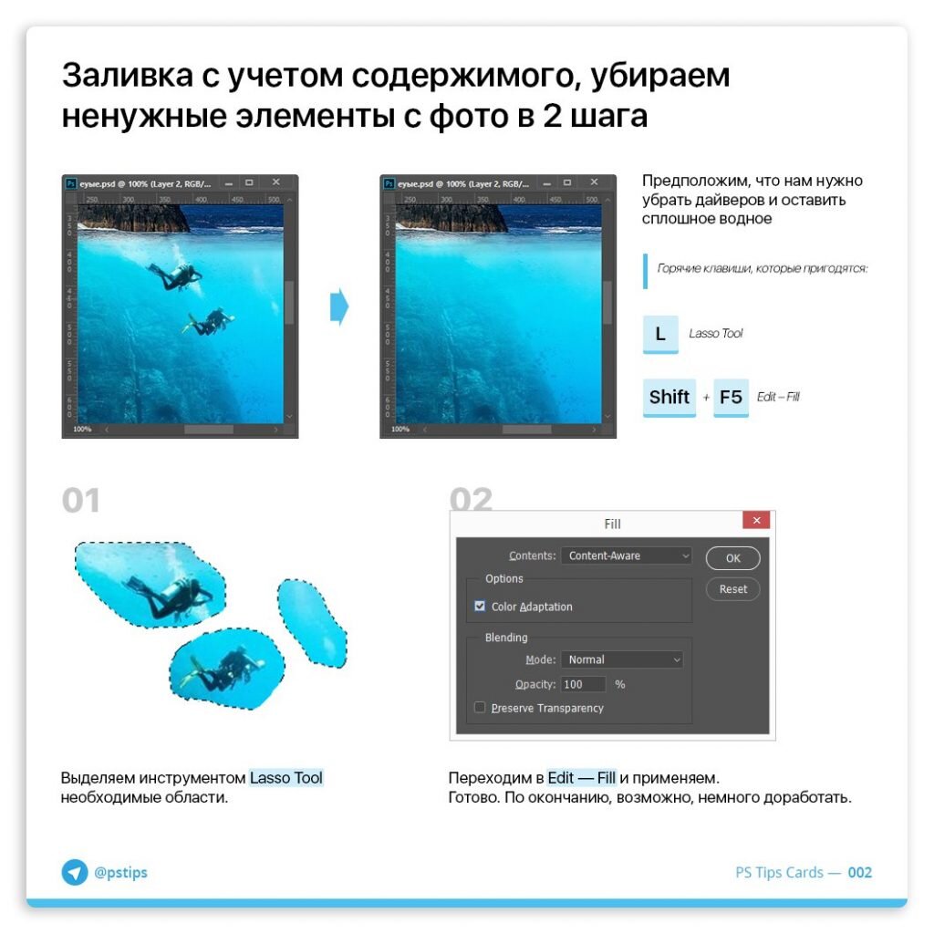 Ребята из проекта Post.Scriptum объясняют базовые инструменты и приёмы Фотошопа в формате карточек — одна карточка на один приём. Ничего экстраординарного, зато очень наглядно и понятно.