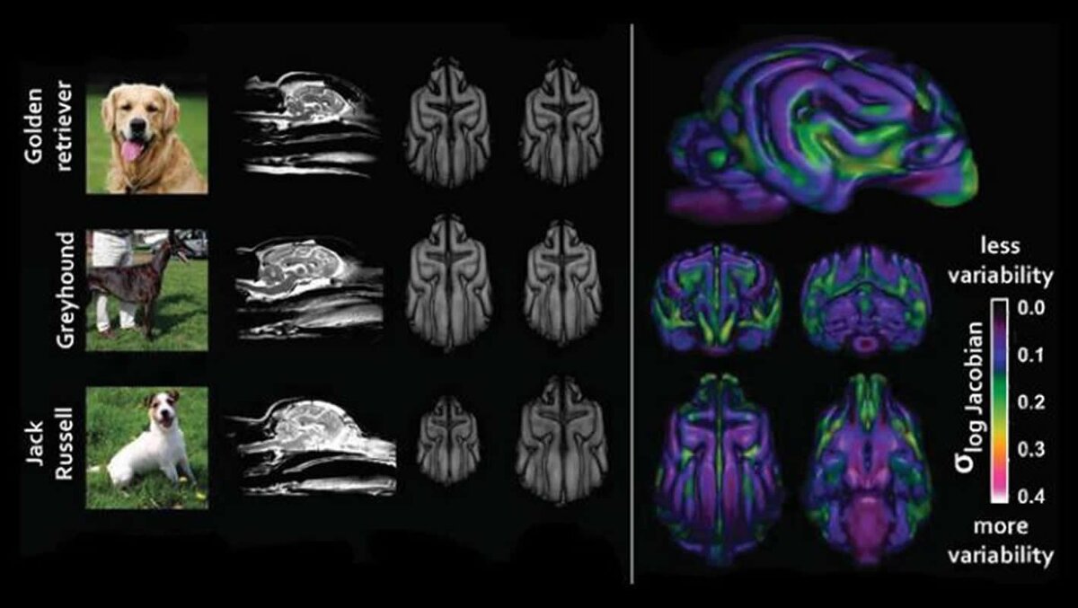 Уже много столетий человек непрерывно занимается выведением новых пород собак, отбирая их как по внешним, так и по поведенческим признакам. При этом, как выяснилось, значительные изменения претерпевает и мозг питомцев. На этом изображении представлены структурные сканы мозга собак трех пород (слева) и объединенное изображение, демонстрирующее сканы всех 33 пород, которые изучались в работе (справа). Градацией цветов от темно-фиолетового (меньшая изменчивость) к зеленому и красному (большая изменчивость) показаны зоны мозга, которые оказались наиболее «чувствительными» к человеческому отбору. Credit: Hecht et al. / JNeurosci 2019 doi:10.1523/JNEUROSCI.0303-19.2019