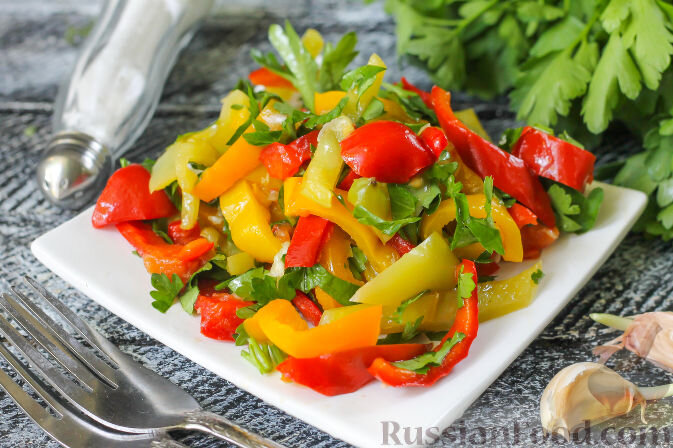 Яркий тёплый салат из жареного перца с петрушкой и чеснокомчрезвычайно прост в приготовлении. При желании его можно дополнить, например, сухариками из белого хлеба или отварным мясом - кто что любит.