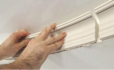 Безусловно, каждый отделочник умеет это делать, потому статья для людей, которые с этим не сталкивались ранее, или у них плохо получается. Впервые в своей практике с полиуретановыми багетом и молдингом я столкнулся в 2009 году, когда делал ремонт в салоне одного из модных магазинов. Мне очень повезло потому, что со мной в паре работал опытный мастер, который и научил грамотно монтировать полиуретан. Как обычно напоминаю о грунтовке. Так же хочу уточнить, что багет и молдинг монтируется до финишной отделки стен. На что клеить полиуретан? Как правило, в магазинах предлагают какой-то клей на основе жидкого стекла, или мастики, но они очень плохо держат тяжелые детали. Потому мы не станем слушать продаванов и пойдем своей дорогой. Понадобится совсем немного финишной шпаклевки и обычный строительный ПВА. Именно строительный, а не малярный, ибо в том пластификаторы и отвердитель, что усложнит удаление излишек. Разводить шпаклевку на ПВА нужно чуть гуще, чем для шпаклевания. Наносим слое