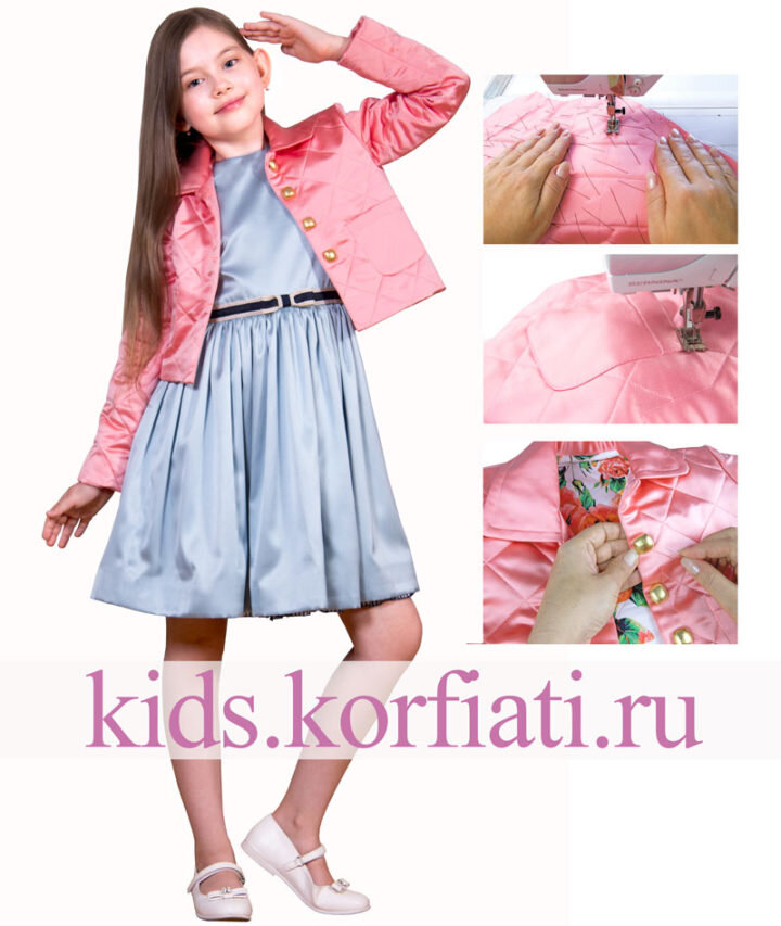 Стеганные изделия находятся на пике популярности, и многие мастерицы увлекаются стежкой и с удовольствием создают собственные неповторимые орнаменты. Предлагаем вам приобщиться к данному виду творчества и сшить укороченную стеганную куртку для девочки из переливчатого атласа Dupon. Яркая цветочная подкладка и золотые металлические пуговицы, напоминающие по форме «ириски», как нельзя лучше сочетаются в этом изделии и создают по-девичьи игривый образ. Выкройку куртки вы найдете в нашем предыдущем уроке: Выкройка стеганой куртки для девочки https://kids.korfiati.ru/kak-sshit-steganuyu-kurtku/