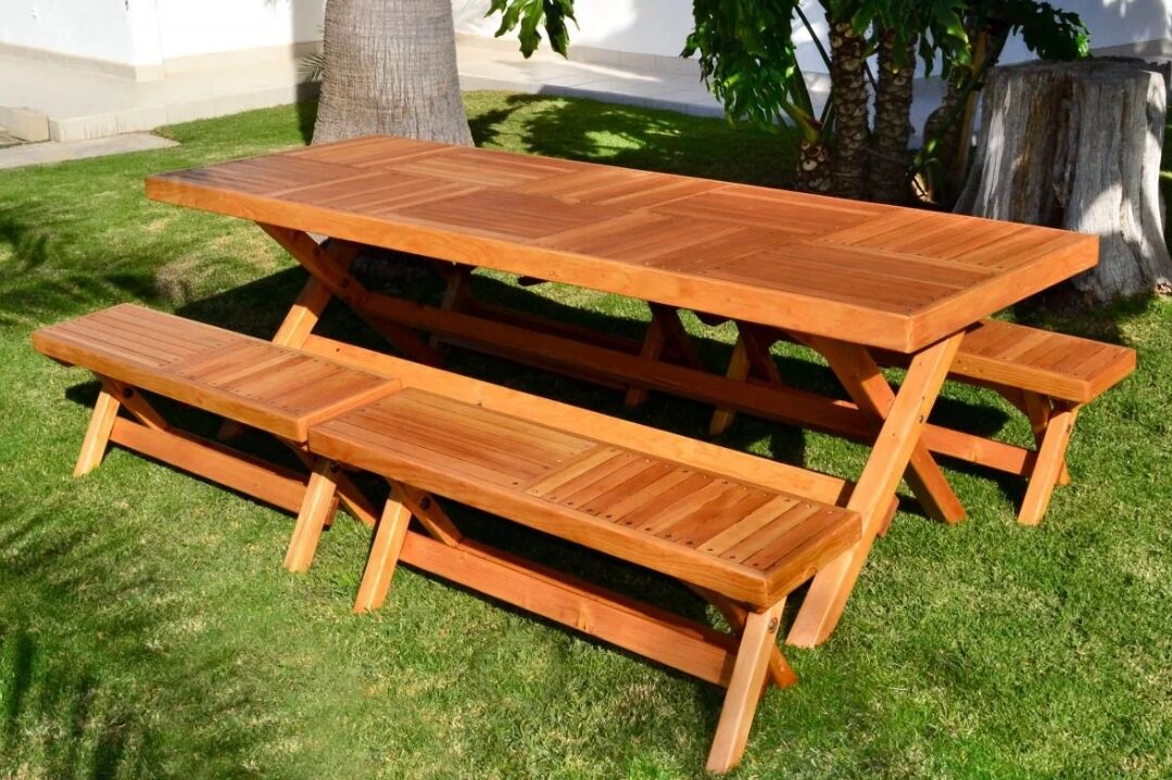 Столик для пикника сделает ваш двор, балкон или открытая площадка на крыше намного привлекательнее и интереснее. Мы расскажем, как сделать такой столик — относительно недорогой и долговечный. 1. Выберите бруски 5 х 10 см или другой пиломатериал, который подходит вам по цене и бюджета. Выбор огромен — от красного дерева и других ценных пород в ДВП, ДСП и т. п. 2. Выберите 14 равных брусков длиной 3 м. 3. Заметьте бруски буквами по мере того, как вы будете их резать. 4. Разрежьте их следующим образом: 5. А — 2 куска по 80 см (рама стола) 6. Б — 2 куска по 1 м 65 см (соединительные элементы) 7. В — 4 куска по 75 см (ножки стола) 8. Г — 8 кусков по 40 см (ножки скамьи) 9. Д — 4 куска по 30 см (рама лавы) 10. Е — 3 куска по 84 см (соединительные элементы) 11. Ж — 2 куска по 86 см (распорки) 12. И — 6 кусков по 1 м 52 см (перекладины ряды — сиденье) 13. К — 8 кусков по 1 м 83 см (верхние перекладины) 14. Обрежьте концы обеих частей А под углом 45 градусов, скосы разных концов