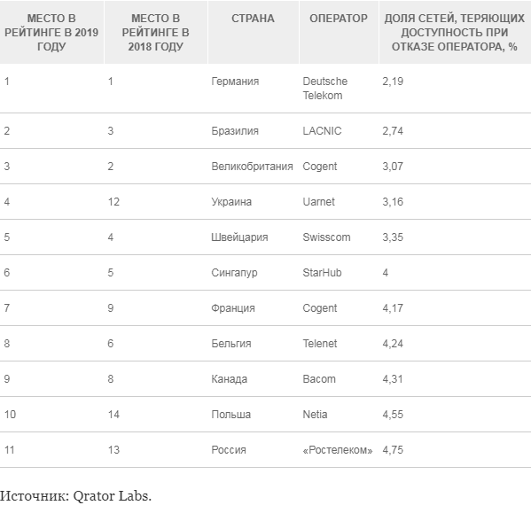 Согласно отчету Qrator Labs, в рейтинге устойчивости национальных сегментов интернета Россия поднялась на 11-ю позицию. Это на две строчки выше, чем в прошлом году. Эксперты изучили в общей сложности 224 страны. Они анализировали отказоустойчивость ключевых национальных интернет-операторов по количеству альтернативных маршрутов прохождения трафика: чем больше, тем лучше. России удалось подняться в рейтинге благодаря более тесному взаимодействию игроков рынка и дальнейшему проникновению провайдеров в регионы. Качественно новый шаг в развитии рунета рынок может сделать, если ускорит внедрение протокола IPv6. По оценке Qrator Labs, доля IPv6 в мире достигла 27%, а в России — всего 3,78%. По мнению технического директора Qrator Labs Артема Гавриченкова, замедление перехода на IPv6 в России может быть связано с недостаточным уровнем компетенций специалистов, а также неготовностью интернет-операторов делать инвестиции в долгосрочной перспективе. Первым из российских операторов сотовой связи
