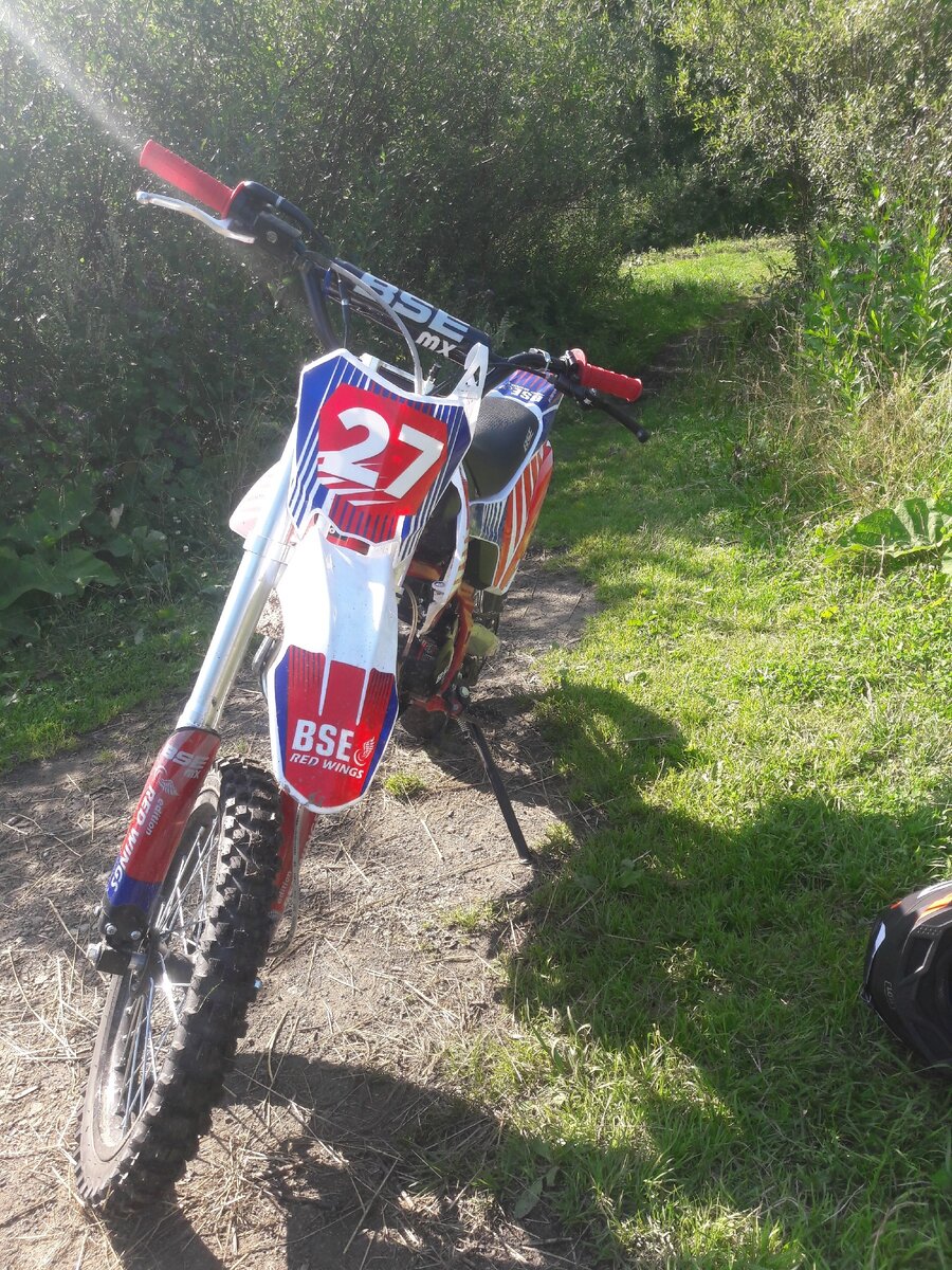 Всем привет! Хочу рассказать о моем опыте приобретения и использования питбайка BSE MX 125. Все началось в начале лета, когда я прочитав сайты с питбайками наконец выбрал себе его. Основными критериями при покупке питбайка у меня были: И вот, мой выбор пал на питбайк от компании bse. У него был 125 кубовый мотор, механическая кпп, не было фары, но это меня не пугало. И так, за 3 месяца использования, я выявил несколько плюсов и минусов. Начнем с плюсов: 1. Надежность двигателя - за время использования никаких нареканий по работе двигателя у меня не было совсем. 2. Внешний вид. А теперь несколько маленьких минусов: 1. 420 цепь - цепь очень сильно растянулась за время использования, натяжители цепи вскоре перестали помогать, рекомендую сменить цепь и звезды на 428. 2. Работа в дождь - во время дождя он может глохнуть. В конце я хочу сказать, что питбайк за свою цену очень хорошь, и его стоит рассматривать для покупки, как первый мотоцикл.