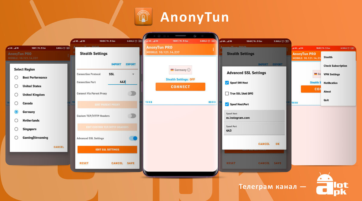 Всем доброго времени! На днях один знакомый @Tyrtyg поделится очень хорошим способом ка сэкономить свой мобильный интернет вот решил этим способом поделиться с вами. Для начала нам нужно будет скачать и установить саму программу AnonyTun (ссылка) и иметь хоть какой – то минимум интернета чтоб была возможность первого запуска VPN. Что это за чудо программа AnonyTun! Если кратко это Туннелированные интернета, прокси, vpn. Всё дело в «шляпе» мы знаем, что за программа теперь перейдём не посредственно к самим настройкам. Для начала выберем страну к которой будем подключаться. Личной мной проверено стабильность работы и скорость передачи данных это через «Germany» вот и выбираем в нашем случаи Германию. Жмём на (Best Performance) – Germany. Страну для дальнейшего подключения мы выбрали! Не спешите нажимать Connect!!! Дале перейдем к самым важным настройкам. С правой стороны жмем на три токи – и выбираем Stealth! И видим перед собой кучу настроек… Теперь будьте предельно внимательны.