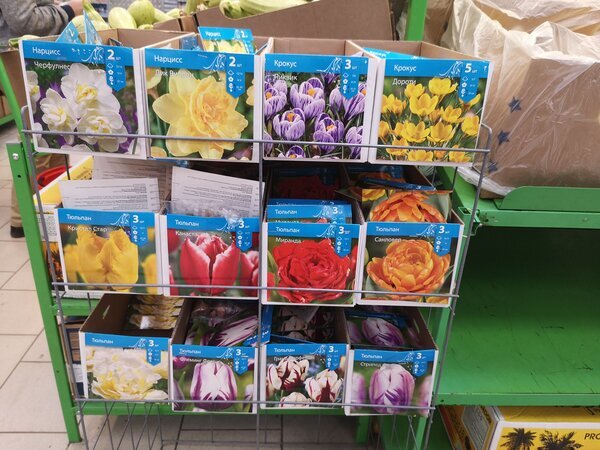 Зашла вчера в Пятерочку, а там стойка с клубнями нарциссов, крокусов и тюльпанов. Глаза мои тут же разбежались, руки схватили парочку самых красивых тюльпанов и нарцисс. Не устояла я перед покупкой. Прям дачная маньячка какая-то стала, обязательно осенью, если вижу интересное что-то из цветов, покупаю что-то новенькое, не могу устоять. Да и как тут устоишь? У меня нарциссы на даче обычные, двух видов- побольше и поменьше, даже сорта не знаю, достались от прежних хозяев. Купила махровые для красоты. Ну , а когда вижу махровые тюльпаны, крышу сносит моментально, кошелек пустеет, а моя коллекция тюльпанов пополняется еще одним экземпляром. Ну или двумя, тремя сортами, если деньги позволяют. Если кому-то интересно, тюльпаны 3 штуки , любые, стоят 99,99 рублей. Нарциссы по 2 штуки 89,99 Крокусы 56,99 рублей, внутри пакетика 5 штук. Могу сказать, что по цене оптимально, как раз в провинции 1 штучка тюльпана стоит 30 рублей. В Леруа получается дороже и больше клубней кладут, не продают