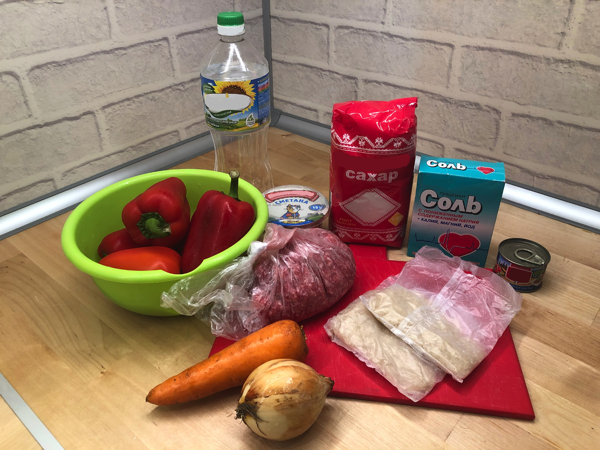 Сладкий и ароматный Ингредиенты: Количество порций - 9; Время приготовления: 1 час 20 минут. Также мне понадобились: кастрюля на 2 литра, средняя сковорода, противень, фольга, миска, тёрка, лопатка для помешивания, ложка, разделочная доска, нож для резки овощей, маленький нож, нож для чистки овощей. 2. Помыла овощи, почистила лук, морковь. Из перцев вынула серединку. 3. Мелко порезала половину луковицы. 4. Обжарила на растительном масле лук в течение минуты, добавила фарш, посолила и слегка прожарила смесь ещё 4 минуты. 5. Смешала фарш с рисом. 6. Начинила перцы фаршем и уложила на противень. 7. Дорезала половинку лука и натерла морковь на крупной тёрке. 8. Прожарила лук на подсолнечном масле, добавила сахар, томатную пасту, сметану и залила водой. Тушила 3 минуты. 9. Залила перцы соусом и отправила в духовку на 45 минут (при 200°). 10. Приятного аппетита!