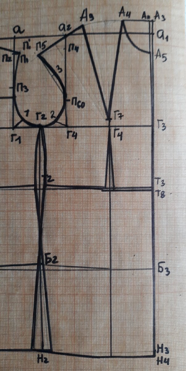 Высшая т. горловины переда А3. От т. Т8 вверх: Т8А3= Дтп+Пдтп ПДтп= Пдтс+Пур Пур- зависит от ассортимента: Платье- Пур= 0,7-1 Жакет- Пур= 1-1,5 Пальто д/с, плащ- Пур=2 Пальто зимнее застежка до верху- Пур=2,5 Пальто зимнее застежка шаль- Пур=3 Влево от А3 горизонталь, на ней: А3А31=0,5( на тип.фигуры). А31 соединяем тоненько с т. Г3 Т8А3= 44,4+1+2=47,4 От А31- ширина горловины У Ж. Шгп (ширина горловины спинки), можно взять с чертежа. А31А4= Сш:3+Пшгс=7,8 А31А5= А31А4+1- глубина горловины полочки. Горловину оформляем циркулем А4А5. Отведение А3А31 можно не делать в изделиях большего объема или если проектируется цельнокроенный подборт. На открытую застёжку отведение можно оставить, тогда построение горловины будет от т. А3. Находим центр груди от т. Г3 Г3Г6= Г3Г4:2-0,5 - платье, пальто д/с, плащ. Г3Г6= Г3Г4:2 - пмльто зимнее. Г3Г6= Цг+0,5Пп - индивидуально. Через т. Г6- вертикали, немного вверх и вниз до линии талии. СТРОИМ НАГРУДНУЮ ВЫТАЧКУ. Из т. А4 - засечка на вертикали Г6 меркой