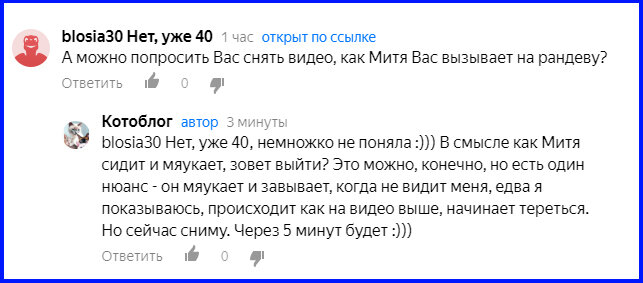 Выполняю просьбу снять видео, как Митя вызывает меня на "рандеву" :))) Имеется ввиду сидит на кухне и зовет выйти (если я правильно поняла просьбу из комментария): Митя так часто зовёт меня, что это не трудно сделать. Так что видео готово, еще сама не смотрела даже 😀 Не знаю, уловил ли микрофон или нет его вопли, просто когда он меня видит, он прекращает завывать и начинает мне что-то говорить на пару порядков тише :)))