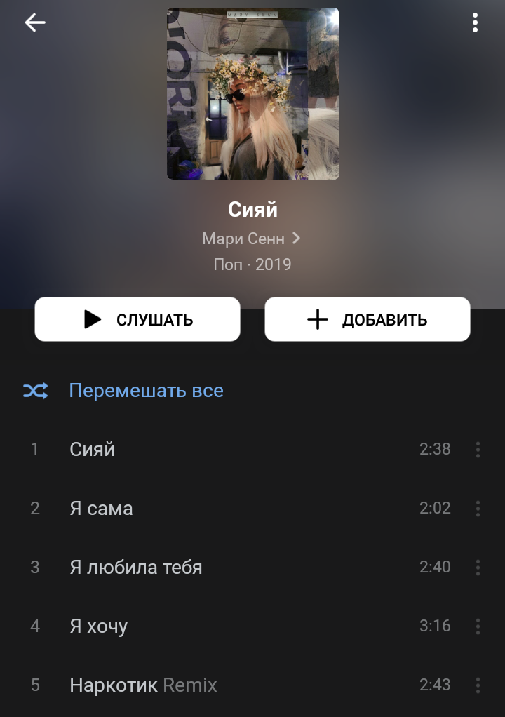 Альбом называется "Сияй". Состоит он из 5 треков, 3 из них абсолютно новые, а 2 уже находились в сети до выхода альбома. Это трек "Я хочу", а также ремикс на трек "Наркотик".