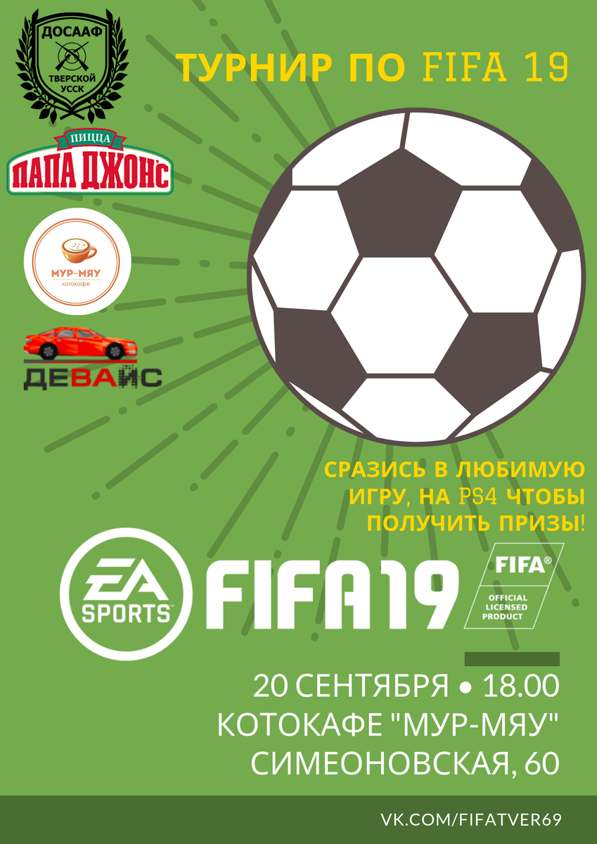 Любители виртуального спорта встретятся на матчах 20 сентября в 18:00 в котокафе «Мур-мяу». Одним из самых популярных симуляторов футбола в мире является игра FIFA. Именно в FIFA 19 и будут соревноваться участники турнира. Всё будет как на спортивных состязаниях самого высокого уровня: жеребьевка, игры плей-офф, а главное - подарки для победителей. Турнир пройдет по адресу Симеоновская 60. Подробности https://vk.com/fifatver69