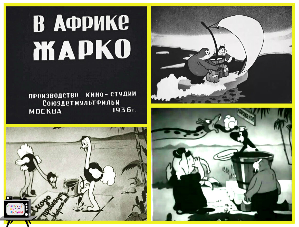 В 1936 году произошло знаменательное событие в истории советской мультипликации. Энтузиасты с «Межрабпомфильма» объединились с мультипликаторами «Совкино», и специальным постановлением была организована киностудия «Союзмультфильм». Правда, сначала она называлась «СоюзДЕТмультфильм», но уже в 1937 году ее название приобрело привычное всем звучание. Первый фильм объединенной киностудии - «В Африке жарко» появился в том же 1936 году. Эту ленту можно увидеть и сегодня. Они сохранилась и хорошо представлена в интеренте. Фильм черно-белый. Персонажи не разговаривают, динамичное действие сопровождает только веселая незамысловатая мелодия. Сюжет картины прост: Животным в Африке невыносимо жарко. Предприимчивая мартышка бреется наладить поставки мороженого с Северного полюса. Первую поставку она сопровождает сама, встречая на пути через океан ряд трудностей. Но мороженое удается доставить до места назначения. Звери радуются. Казалось бы, ничего особенного ни в графике, ни в сюжете нет. Но это
