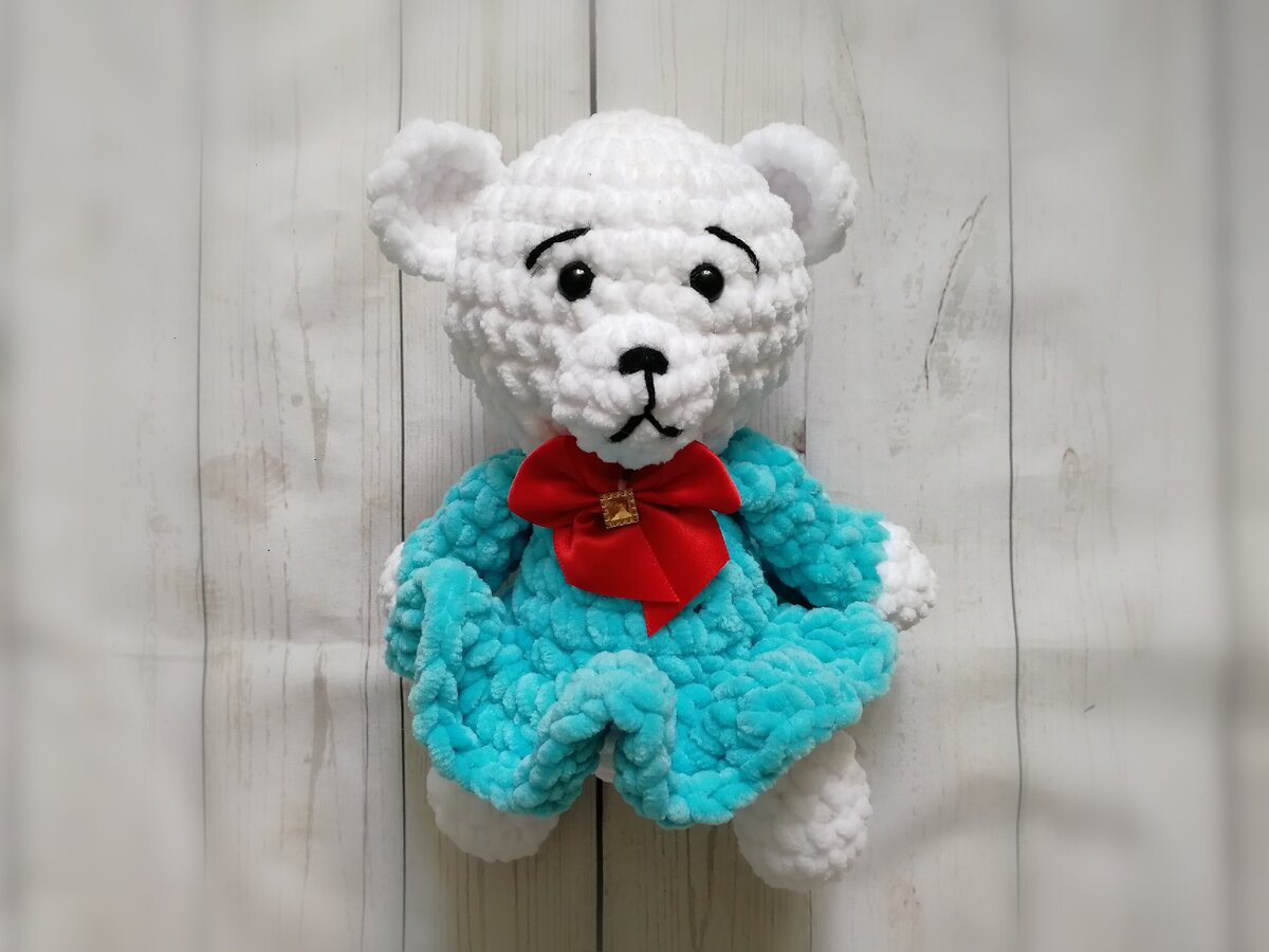 Всем привет! Связалась у меня прекрасная мишка-малышка по описанию @deynega_yuly (аккаунт в ИГ). Нам нужны: плюшевая пряжа двух цветов, подходящий по размеру крючок, черная нить для оформления мордочки, глазки на безопасном креплении, маркер для петель, игла, ножницы. Петли: воздушная петля (ВП), столбик без накида (СБН), соединительный столбик (СС). Термины и сокращения: ПР — прибавка, У — убавка. Подробнее о них можно посмотреть в фотоуроках сайта (ссылка в профиле). Голова 1р. 2 ВП, во вторую петлю от крючка 6 СБН 2р. 6 ПР (12) 3р. (1 СБН , ПР)*6 раз(18) 4р. (2 СБН, ПР)*6 раз (24) 5р. (3 СБН, ПР)*6 раз (30) 6р.-9р. 30 СБН 10р. (3 СБН, У) *6 раз (24) 11р. (2 СБН, У)*6 раз (18) 12р. (1 СБН, У)*6 раз (12) Ушки (2 детали) 1р. 2 вп, во вторую петлю от крючка 6 СБН 2р. 6 ПР (12) Мордочка 1р. 2 ВП, во вторую петлю от крючка 6 СБН 2р. 6 ПР(12) 3р. 12 СБН Ножки (2 детали) 1р. 2 ВП, во вторую петлю от крючка 6 СБН 2р. 6 ПР(12) 3р.-4р. 12 СБН(2 ряда) 5р. (1 СБН, У)*4 раза (8) 6р.-8р.