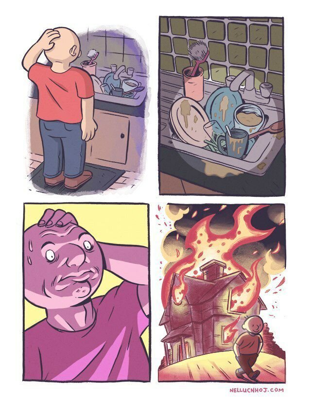 Спасибо всем художникам, которые смогли изобразить обычные, на первый взгляд, ситуации, в комическом ключе. Как же иногда пугает грязная посуда... Все мы были студентами... А у вас есть котик, которому сначала нужно потрусить миску? Ну так же со всеми бывает, правда? Это они еще не знают про 30... Бонус: давайте так не будем, даже перед животными стыдно...