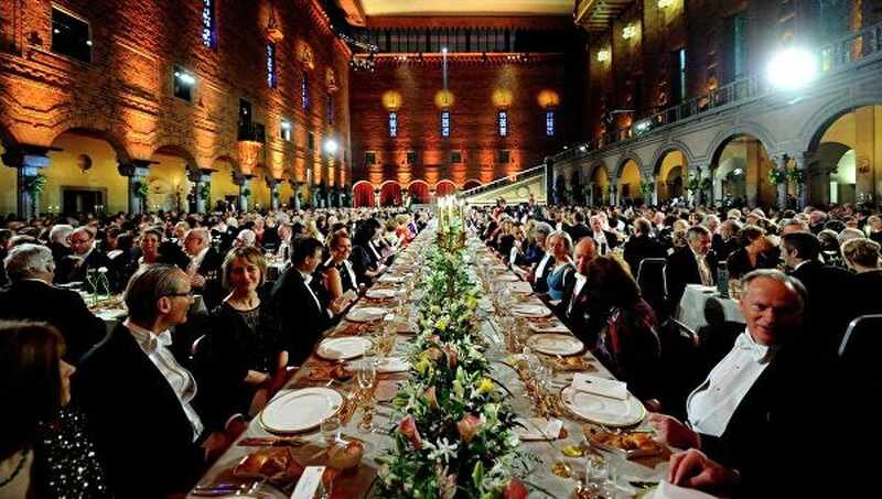 Посмотреть церемонию награждения лауреатов Нобелевской премии может в наше время любой желающий, трансляция идет на многие страны мира. А вот банкет для лауреатов – не менее любопытное мероприятие. Он является неотъемлемой частью торжества, но попасть туда могут лишь немногие, количество мест строго регламентировано. Причем, соблюдаются определенные ритуалы, которые не меняются много лет. Начало банкета – 10 декабря каждого года ровно в 19 часов. Лауреаты престижной премии вместе с королем и королевой Швеции спускаются в зал, где их уже ждут приглашенные лица. Каждый лауреат может пригласить гостей, но есть одно условие – не более 16 человек. Король идет в паре с одной из женщин, получивших премию. Если таковых не оказалось, то с женой лауреата-физика. В начале мероприятия звучат два обязательных тоста. Первый из них – за монарха, то есть короля Швеции, второй – за учредителя премии Альфреда Нобеля. Ни в коем случае нельзя менять их очередность. С 1974 года банкет проводится в Голубом