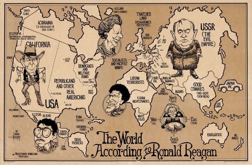Карта с заголовком: "Мир по мнению Рональда Рейгана", 1980-е гг. Соединённые Штаты Америки разделены на 6 частей, где: Аляска – это Санта Клаус; остальная территория страны разделена на Калифорнию, республиканцев и других настоящих американцев, демократов и благотворительность; на северо-западе имеется небольшая территория экотопии; город Сан-Франциско позначен как "гомоc". Канада уменьшилась в своих размерах и подписана как кислотнодождливая (дочерняя компания корпорации США). Европа представлена социалистами и пацифистами-слабаками. Великобритания – это просто Тэтчерленд (прототип рейганомики). СССР – империя зла.
