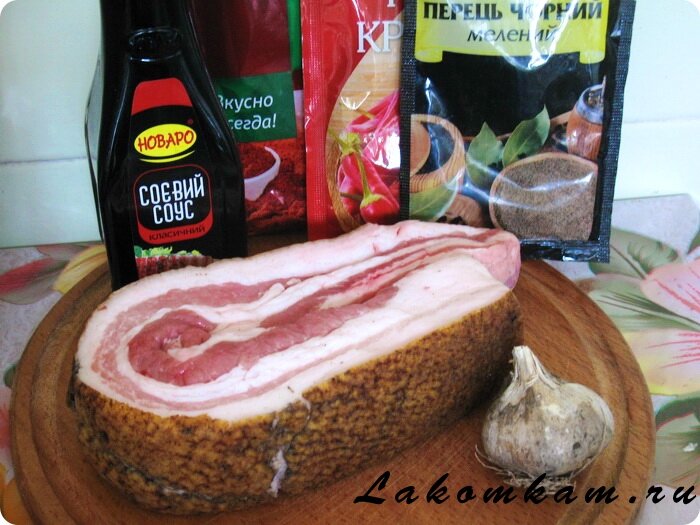 Ингредиенты: свиное сало свежее (с прослойкой мяса) – 600 грамм; чеснок – 5 зубчиков; соевый соус – 300 миллилитров; соль – 1 чайная ложка; перец чёрный молотый, красный и паприка – по вкусу.