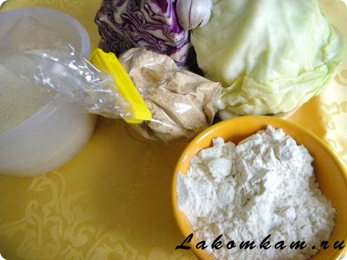Ингредиенты: белокочанная капуста – ½ кочана; краснокочанная капуста – ½ кочана; репчатый лук – 1 штука; панировочные сухарики; чеснок – 1 долька; манная крупа – ½ стакана; мука пшеничная – ½ стакана; соль – по вкусу; оливковое масло.