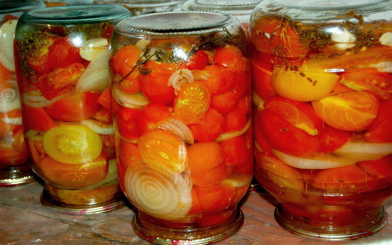 Помидоры по этому рецепту получаются невероятно вкусными! Попробуйте, ведь рецепт совсем несложный. Зимой такие помидорчики уходят очень быстро. Итак, нам потребуются: помидоры, лук, чеснок, зонтики укропа, лавровый лист, душистый перец горошком, чёрный перец горошком, соль, сахар. Помидоры моем, разрезаем на две половинки, удаляем место плодоножки. Если помидоры большие, их можно разрезать на четвертинки. Лук нарезаем кольцами, каждый зубчик чеснока разрезаем пополам. Банки моем с содой, стерилизуем над паром 10 минут. В кипящей воде стерилизуем завинчивающиеся крышки. На дно 0,5-литровой баночки кладём зонтик укропа, лавровый лист, 2-3 половинки дольки чеснока, 2-3 горошины душистого перца, 2-3 горошины чёрного перца, лук кольцами. Сверху укладываем половинки помидоров, кладём их срезом вниз. Прижимаем плотно друг другу. Когда баночка наполовину заполнена, кладём слой лука. И кладём помидоры до самого верха банки. Заливаем помидоры кипятком. Делаем это постепенно, чтобы ба