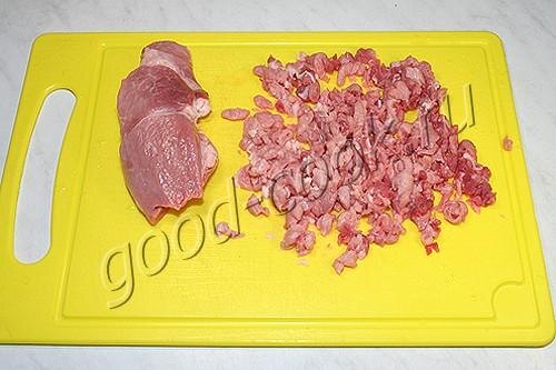 Мясо очень мелко нарезать острым ножом. Сало нарезать кубиками.