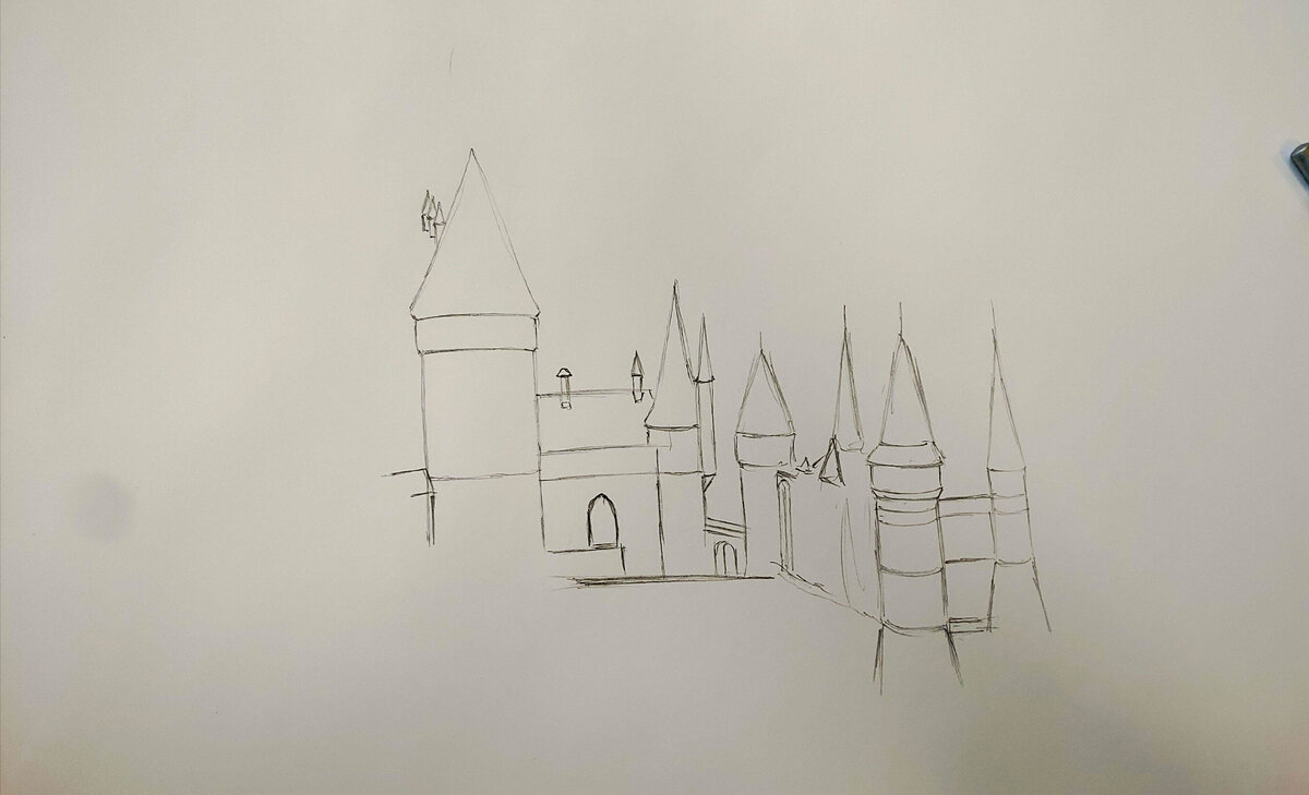 Предыдущий пост. В этот раз поговорим о наброске. Это первое с чего начинается рисунок. Вряд ли вообще возможно сотворить более или менее приличную картину без наброска. Он помогает точно распределить все элементы рисунка на листе, их размер, наклон и множество других параметров. Как и для любого дела, план действий - хороший помощник. Набросок необходим при создании крупных композиций, на листах А3 и более. Чем больше я пытаюсь рисовать, тем больше стараюсь подмечать для себя разных аспектов этого хитрого занятия. С персонажей комиксов я переключился на архитектуру. Во много на это влияют творческие каналы на YouTube. В данном случае этот. Здания большие и маленькие, все что с ними связано. Итак, я замахнулся на святое для многих - Хогвартс. Получилось, прямо скажем, не супер, перспектива хромает, но в целом я доволен. Будем продолжать двигаться в этом направлении. Лист А3, 3 недели мучений. Смотрим.
