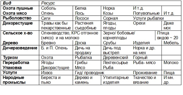 В комментариях всплыл вопрос о том, что тайга, мол – обуза государству – скорее б ее вырубить и продать куда-нибудь. И ничего она не стоит. Утрирую. Но, тем не менее, вопрос такой стал. Навскидку набросал табличку, где – виды деятельности соотносятся с ресурсами тайги. Оказалось что и видов деятельности больше 10 и ресурсов больше 150. А запасов и вовсе немерено. И дяденьки, которые летом утверждали, что выгоды тайгу тушить нет – слегка заблуждались. Кому интересны запасы, скажем, на 1000 га – отпишитесь – посчитаю. В царские времена к перечисленным добавлялись деревянные суда, золотодобыча, жженый уголь, минералы, отхожие промыслы, пароходные дрова. Хотя, и в нашей действительности хороший паровичок на реке снова не повредит. Как показывает практика нефтесосы - не наедятся – рассчитывать на это глупо. Спрашивается - почему царские министры, уж на что ушлые были сатрапы, и то не догадывались все эти виды деятельности по отдельности налогом обложить. А брали по беле (белке) с