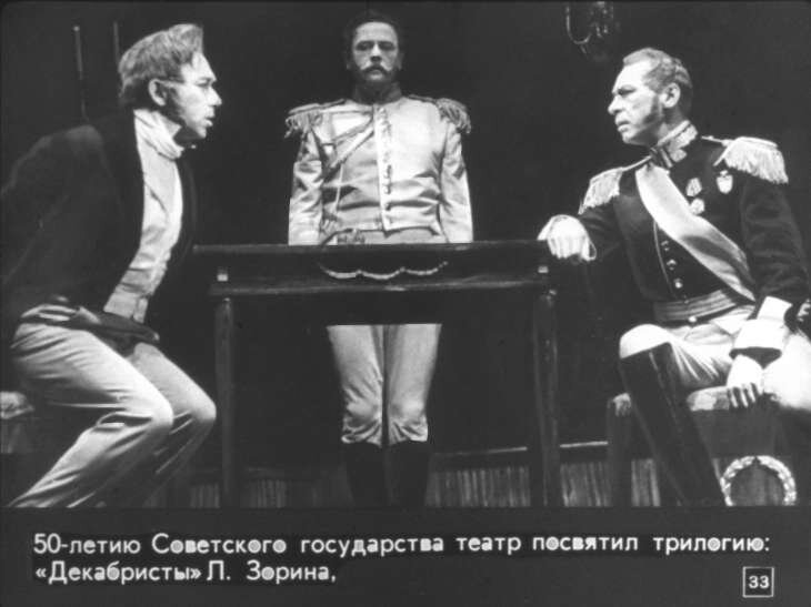 О. Табаков в роли Рылеева, О. Ефремов - в роли Николая I... Культовый спектакль "Современника" В 1967 году в "Современнике" шла драматическая трилогия, посвященная, разумеется, 50-летию революции. Первая часть была посвящена декабристам, по пьесе Леонида Зорина. Третья часть этой трилогии - "Большевики" сохранилась в записи 1987 года. Л. Зорин писал пьесу специально для "Современника", для этой постановки. "«Архивы больше не отпускали. И можно ли называть архивом такое вместилище страстей? Всё живо, не улеглось, пульсирует, какой я Пимен, я соучастник!» (Леонид Зорин). Это, наверно, каждый, кто заглядывает, в эти архивы ощущает на своей шкуре - не улеглось, все живо и пульсирует, ты соучастник. Полосатая, серая с черным, как будка времен николаевской империи, суконная рама, окаймляющая место действия. А над сценой парит и давит золотая царская корона... В этом символически очерченном и неподвижном пространстве стремительной чередой проходят события и годы - 1816, 1817, 1820, 1825, балы