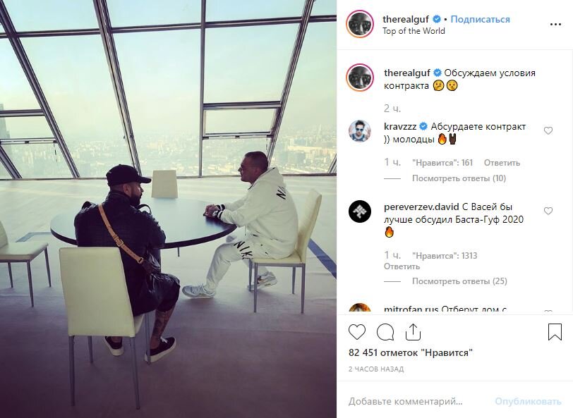 Алексей Долматов выложил в сеть совместное фото с коллегой по сцене Тимуром Юнусовым. Рэп-исполнитель Гуф в своем аккаунте в Instagram выложил фото, сделанное в одной из высоток «Москва-Сити». На снимке Алексей Долматов сидит за круглым столом со своим коллегой по сцене Тимати. «Обсуждаем условия контракта», — написал Гуф под публикацией. Вполне вероятно, что подобное заявление рэпера может оказаться шуткой. Звезды российской рэп-индустрии могли встретиться просто так или, к примеру, обсудить будущий совместный проект. Подписчики Гуфа весьма неоднозначно восприняли данную публикацию. Основная масса комментариев пользователей написана в нецензурной и грубой форме, среди них нашлись и более сдержанные. «Да ладно… Лех, ты шутишь?» «Дядя Леша на работу устраивается» «Никогда в жизни, не делай этого!» «У тебя температура?» — недоумевают фанаты.