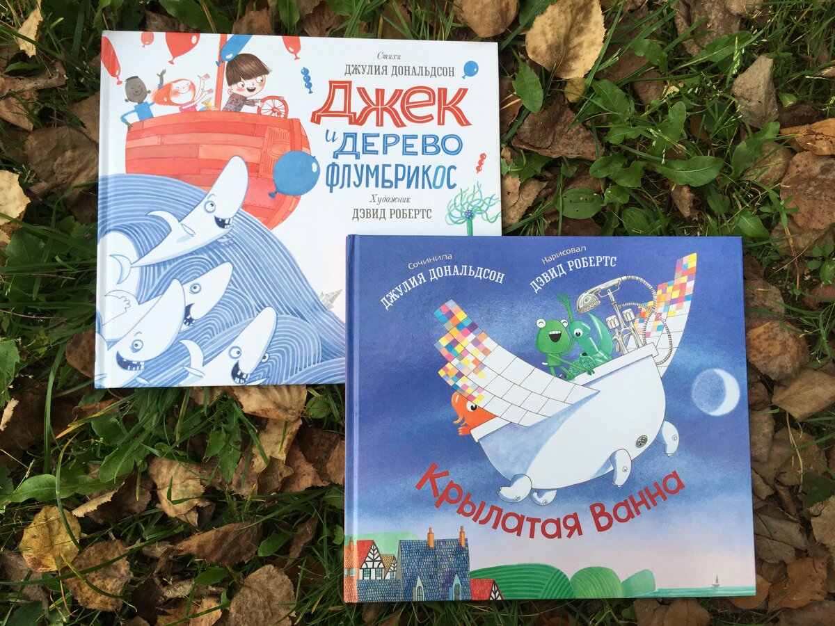 Бывает, читаешь книги не первый десяток раз, но в упор не замечаешь, что нарисовал их ОДИН художник! Наверное, все знают, что Аксель Шеффлер спрятал Груффало почти во всех книгах Джулии Дональдсон в том или ином виде. И дети, и родители обожают его искать. А я в принципе люблю находить в детских книгах на иллюстрациях отсылки к другим книгам. Каково же было моё удивление на днях! «Крылатую ванну» скоро смогу цитировать с закрытыми глазами, Эля очень любит книгу и часто приносит её почитать. А вот про Джека и дерево флумбрикос не читали с ней ни разу, я всегда считала, что эта книга явно 3+, если не старше. Но тут Эля сама взяла её с полки, сели читать втроём, и на первом же развороте Рита мне говорит: «Мама, смотри, мюкла из Крылатой ванны». (Справка: благодаря книгам про Петсона и Финдуса Свена Нурдквиста, все непонятные кракозябры в книжках у нас теперь называются мюклами.) Мне осталось лишь взглянуть на имя художников в обеих книгах, убедиться, что это один и тот же человек — Дэвид