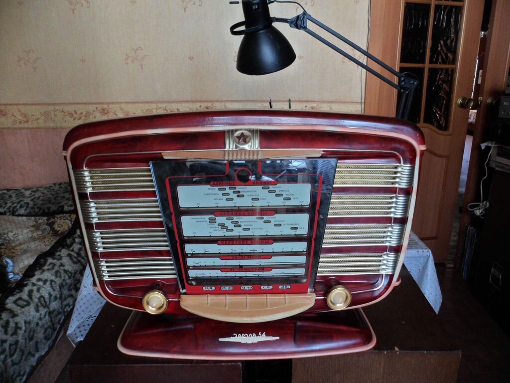 Всех приветствую! Сегодня речь пойдет о ламповом радиоприемнике Звезда-54.Краткая информация о нем : Выпускался на Харьковском заводе Коммунар и Московском заводе Мосприбор с 1954 года.Данный приемник произвел фуррор на момент выхода,о нем писали газеты,что это был прорыв,он появился словно искра,дизайн его не оставляет равнодушным многих и по сей день.Звезда -54 точная копия французского приемника Excelsior-52,по некоторым данным его привезли дипломаты,либо же был специально куплен для копирования.Всего было выпущено 674000 радиоприемников. Приобрел я данный приемник не так давно за 3500р,покупал его в другом городе с пересылом,переживал как продавец упакует,да и вообще отправит ли,много уже случаев (продавцов фоток).Но все дошло в лучшем виде,и даже шкала не треснула,пересылка обошлась в копейки что-то около 1500р. Состояние было плачевное,шкала осыпалась,корпус нуждается в перекраске,отстутствие одной ручки,сломанный шильдик,осутствие задней стенки,и конечно же не исправный унч. Вс