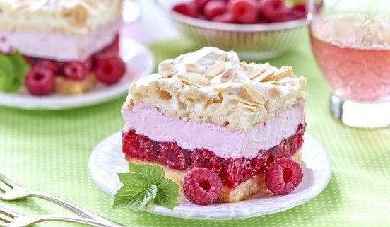 Классический детский десерт, который вы будете делать из своих любимых ягод. Бисквит, безе и фрукты - предварительный просмотр восхитительного пирога. Традиционный рецепт малинового облака Ингредиенты: Для желе: 500 г свежей малины 2 пакетика малинового или клубничного желе Для бисквита: 5 яиц 1,5 стакана муки Стакан сахара Для крема: Упаковка помадного крема Полстакана сахара 3 чайные ложки лимонного сока Для безе: 5 белка 3 чайные ложки сахара Сначала сделайте бисквит. Тщательно взбить белки до образования устойчивых пиков. Добавьте сахар и один желток по одному. Наконец, добавьте просеянную муку партиями. Смешайте все с помощью силиконового или деревянного шпателя. Переложить в квадратную или круглую форму, облицованную бумагой для выпечки. Выпекать в течение 20 минут при температуре 160 градусов по Цельсию до золотистого цвета. Охладить бисквит. Растворите желе в меньшем количестве воды, чем указано на упаковке. Остудите и положите малину в слегка застывающую жидкость. Разрежьте б