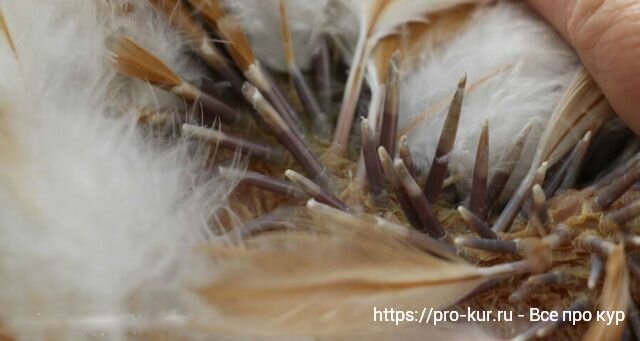 Новые перышки выталкивают старые перья, как начинают расти. Куры могут выглядеть как угодно, от маленьких заплешин со всех сторон, до почти совсем лысого тельца.